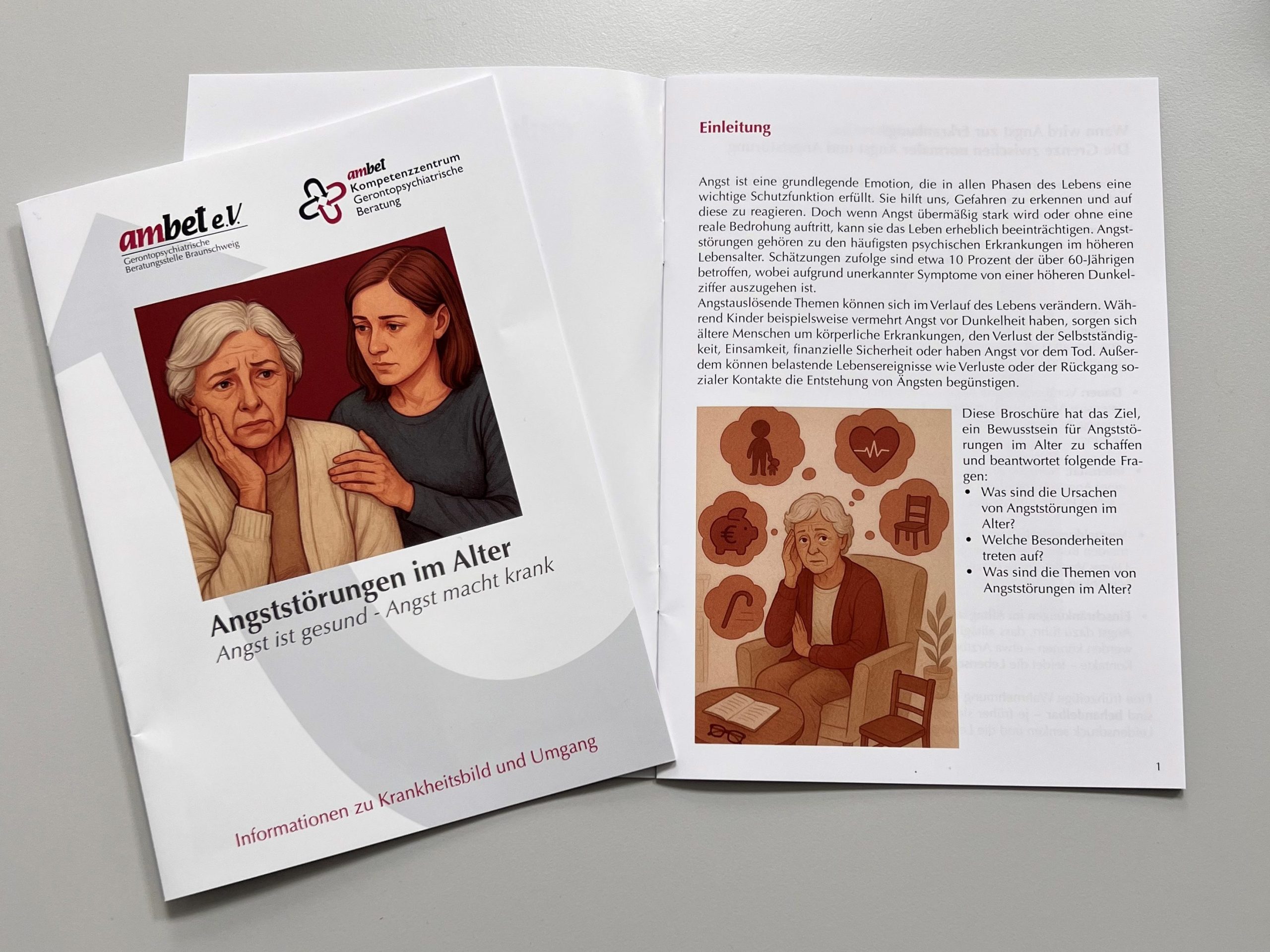 Eine neue Broschüre des ambet Kompetenzzentrum Gerontopsychiatrische Beratung & Landesfachstelle Demenz Niedersachsen, die in Kooperation mit der Gerontopsychiatrischen Beratungsstelle Braunschweig entstanden ist, informiert über das Thema Angststörungen im Alter. Sie richtet sich an alle älteren Menschen sowie deren An- und Zugehörige und informiert über Erscheinungsbild der Erkrankung, Behandlungsmöglichkeiten und Anlaufstellen. Besonders ausführlich werden die unterschiedlichen Symptome und der Umgang damit thematisiert. Auch Angehörige erhalten konkrete Hinweise, wie sie Gespräche sensibel führen und Betroffene unterstützen können.